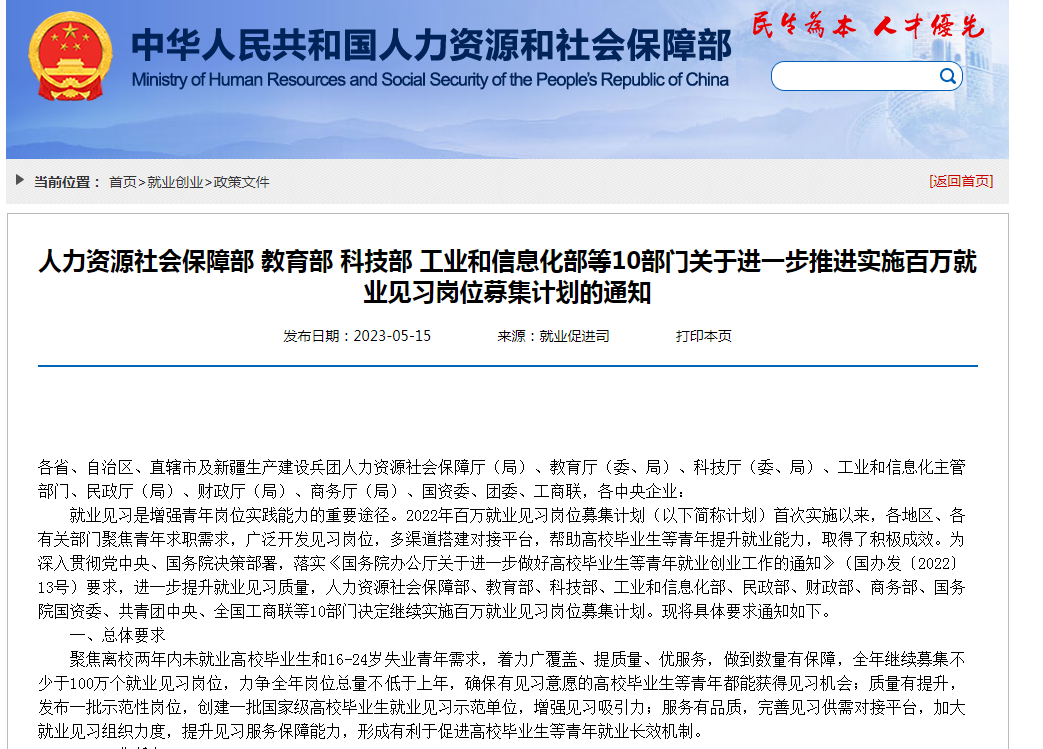 人力資源和社會保障部等10部門日前印發(fā)《關(guān)于進(jìn)一步推進(jìn)實(shí)施百萬就業(yè)見習(xí)崗位募集計(jì)劃的通知》,決定繼續(xù)實(shí)施百萬就業(yè)見習(xí)崗位募集計(jì)劃,幫助高校畢業(yè)生等青年提升就業(yè)能力。
