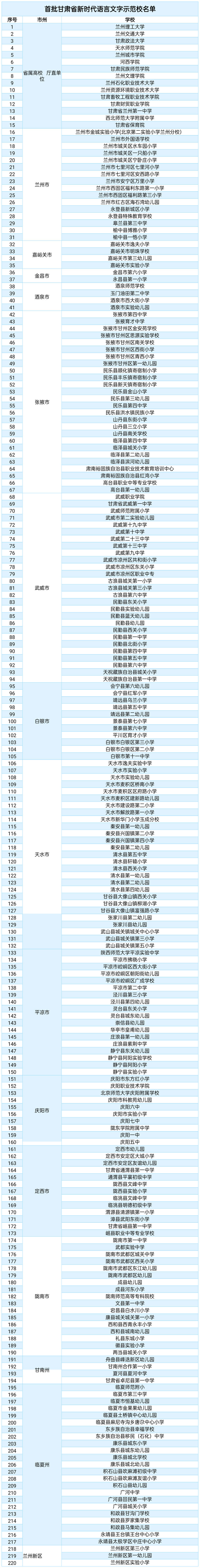 根據(jù)《甘肅省教育廳關(guān)于開(kāi)展新時(shí)代語(yǔ)言文字示范校創(chuàng)建工作的通知》,在各學(xué)校創(chuàng)建、市(州)縣(市區(qū))評(píng)估、省級(jí)評(píng)估認(rèn)定的基礎(chǔ)上,經(jīng)省教育廳常務(wù)會(huì)議審議,擬命名蘭州理工大學(xué)等220所學(xué)校為首批“甘肅省新時(shí)代語(yǔ)言文字示范?!?,現(xiàn)予以公示,接受廣大群眾監(jiān)督。